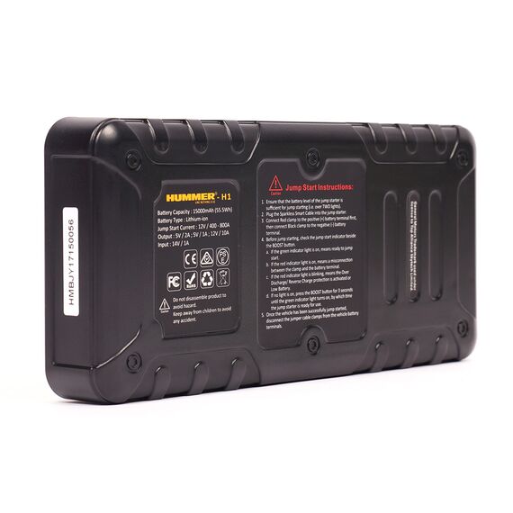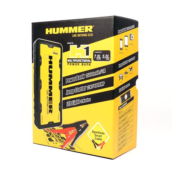 Современное многофункциональное портативное пусковое устройство HUMMER H1 - благодаря пусковому току 800 А, способно запускать как 7-ми литровые бензиновые, так и 5-ти литровые дизельные двигатели. Зажимные клеммы устройства обладают интеллектуальной защитой от обратной полярности, сверхтока, обрыва цепи и перегрева.